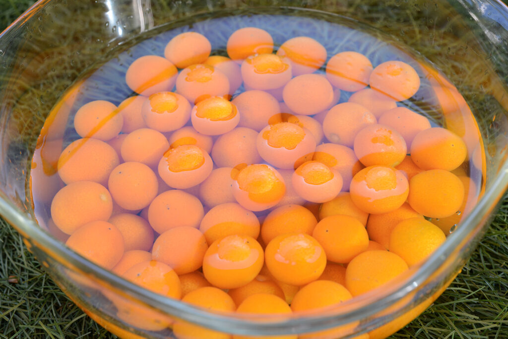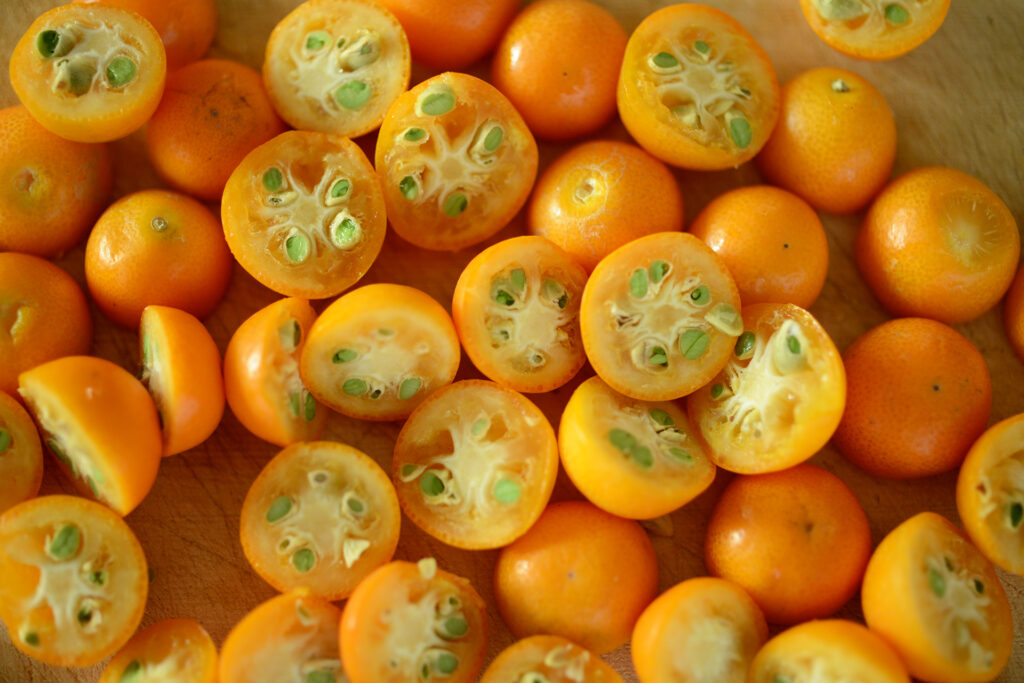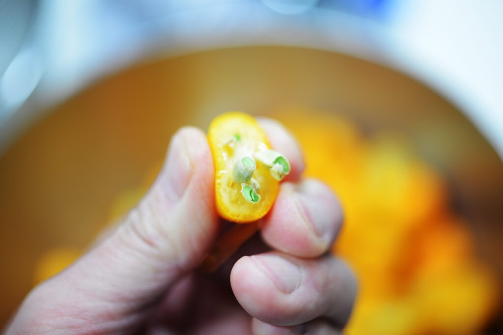 ヘタを取り除き半分に切り分ける。綺麗な若葉色した種が皮のオレンジに映える。指で摘まんでギュッと潰すとタネが飛び出してくる。