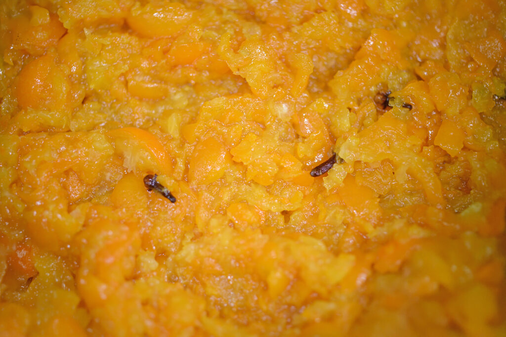 エグ味がないので内側の白い筋部分もそのまま、きび砂糖を果実の18~20%量ほどと一緒に煮込む。砂糖控えめで長期保存はできないけど、家庭用なので果実の甘みで十分。しなってきたら、全体量の2/3ほどを取り出してフードプロセッサーでペースト状に。また鍋に戻してクローブの身を数個入れ、好みのとろみまで煮詰めてレモン汁を加える。